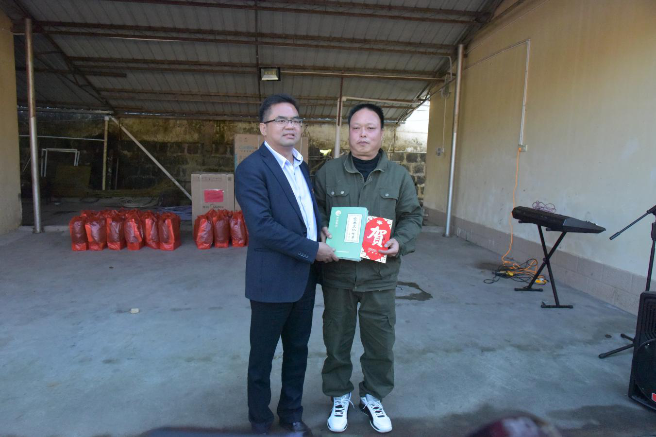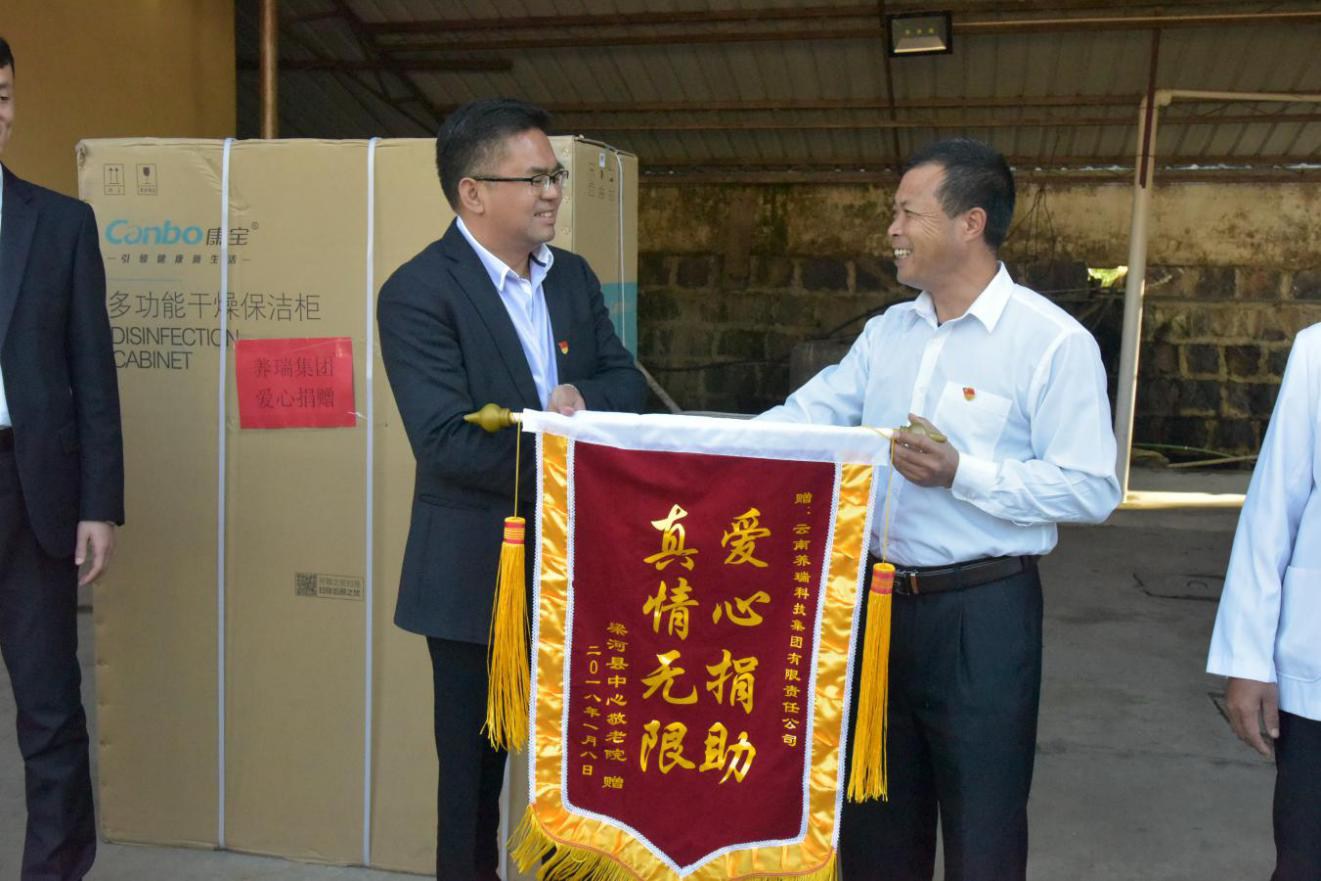 集團黨支部書記、總裁邵全向梁河縣敬老院院長董保雙捐贈愛心款和物資