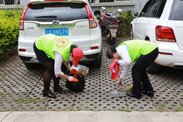 園區垃圾站旁邊的幾個綠化帶彌漫著熏臭味,綠化帶里的白色垃圾、塑料、紙屑等隨處可見。志愿者們拿著火鉗、帶著掃帚,仔細的進行清掃。黨員同志率先垂范,對部分難以清理的垃圾更是直接用手進行清理,擼起袖子加油干,就連散落在綠化帶中細小的煙頭、竹簽都進行了徹底的清掃,掃出來的垃圾足足拉滿了8個清運垃圾推車。