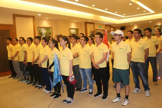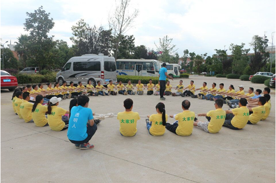 早上8:00,換上印有“大家好”字樣的黃色司服,全體養(yǎng)瑞人在歡聲笑語(yǔ)中踏上了前往嵩明的拓展旅程。上午10點(diǎn),拓展活動(dòng)正式開(kāi)始。經(jīng)過(guò)開(kāi)場(chǎng)的破冰游戲和團(tuán)隊(duì)組合,全體人員組成了三個(gè)小分隊(duì),分別是東方紅隊(duì)、鴻雁隊(duì)、追夢(mèng)者隊(duì)。各隊(duì)推舉了隊(duì)長(zhǎng)和政委,迅速地?cái)M定了隊(duì)名、口號(hào)及隊(duì)歌,PK較量拉開(kāi)了序幕。