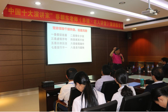 2016年5月14日,養瑞集團全體員工齊聚集團大會議室,從上午8:00到下午18:00,將近9個小時紀律嚴明的演講報告會,聽眾全神貫注,紀律嚴明。蔡朝東老師以他從軍、從政和幾十年來人生經歷的感悟,給我們帶來了一次次思想碰撞和精彩交流,掌聲此起彼伏,演講催人淚下。
