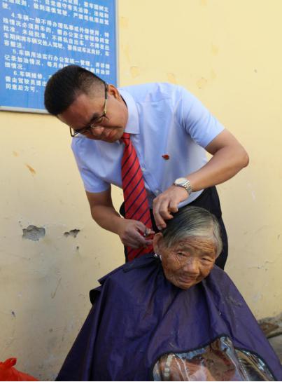 養(yǎng)瑞集團(tuán)黨委書記、董事長、總裁邵全為百歲老人修剪頭發(fā)