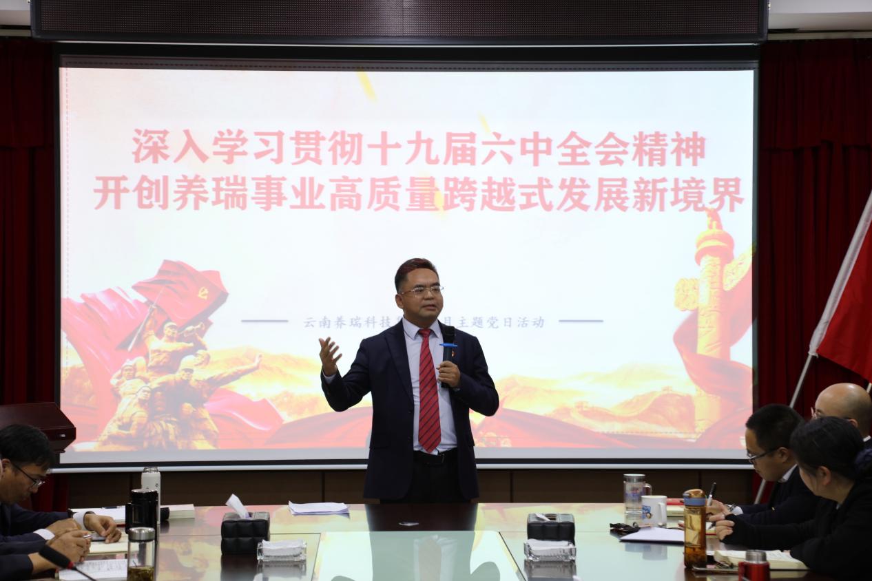為深入學習貫徹黨的十九屆六中全會精神,把養瑞黨員和全體養瑞人的思想統一到黨中央決策部署上來,引導養瑞人樹牢聽黨話、跟黨走的信仰信念信心,高質量地完成年度工作目標任務,11月19日,云南養瑞集團黨委組織召開題為“深入學習貫徹黨的十九屆六中全會精神 高質量推進年度工作目標任務圓滿完成”的主題黨日活動。