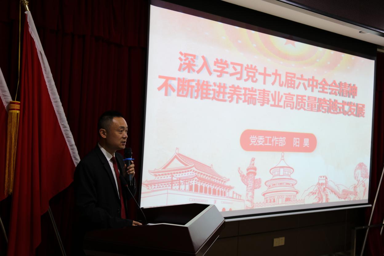 全體養瑞人要把學習好、貫徹好、落實好黨的十九屆六中全會精神作為當前和今后一個時期的重要政治任務,迅速興起學習貫徹熱潮,深刻認識全會精神的核心要義,深刻領會中國共產黨百年奮斗的偉大成就、歷史意義和寶貴經驗,更加自覺把思想和行動統一到全會精神和黨中央號召上來,真正用全會精神統一思想、凝聚共識、堅定信心、增強斗志,切實把黨的百年奮斗重大成就和歷史經驗,轉化為推動養瑞事業高質量發展和明責履責盡責的強大精神力量。