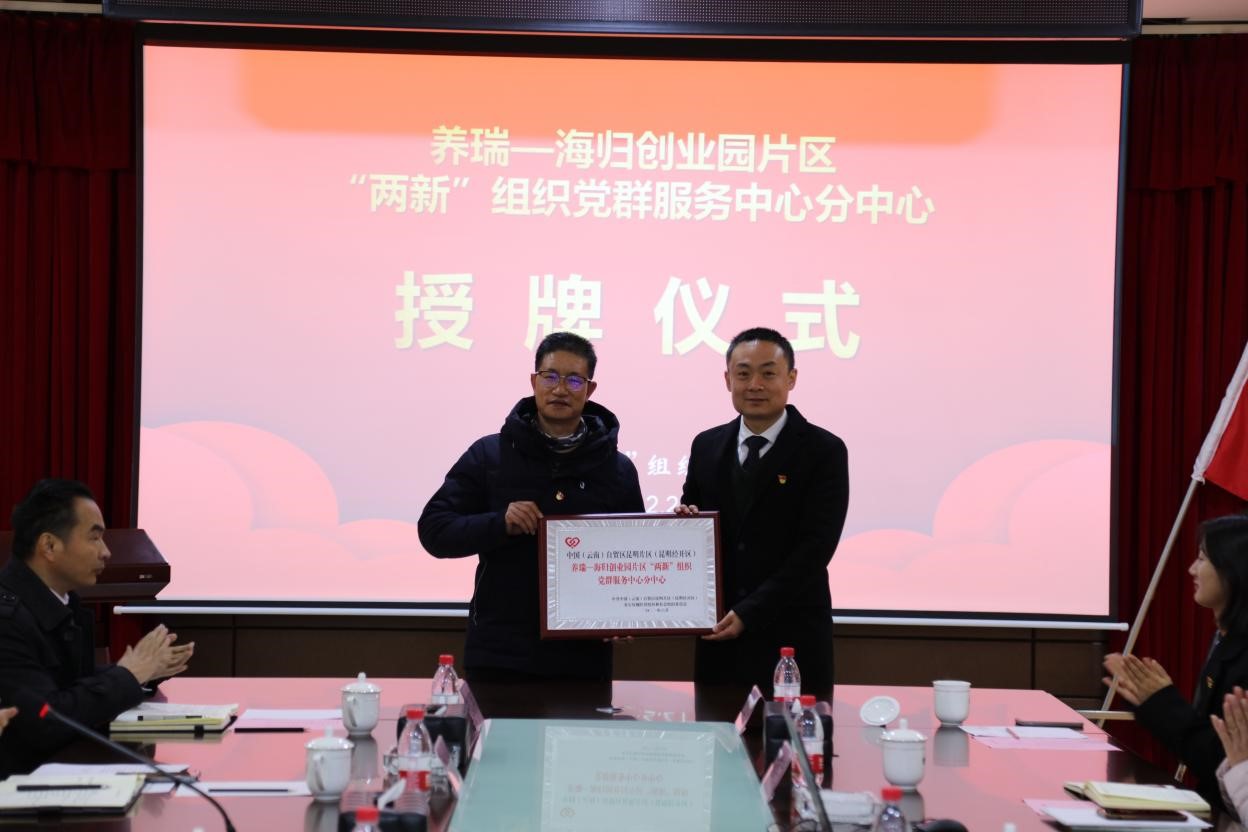 為充分發揮基層優秀黨組織書記的傳幫帶作用,創新優化黨組織書記隊伍建設,全面提升城市基層黨建各領域工作整體水平,2022年2月21日下午,經開區“兩新”組織黨委書記李建華帶領經開區5家企業的黨務工作者到云南養瑞集團召開“名書記”工作室座談會議,舉行“養瑞—海歸創業園片區‘兩新’組織黨群服務中心分中心”授牌儀式。