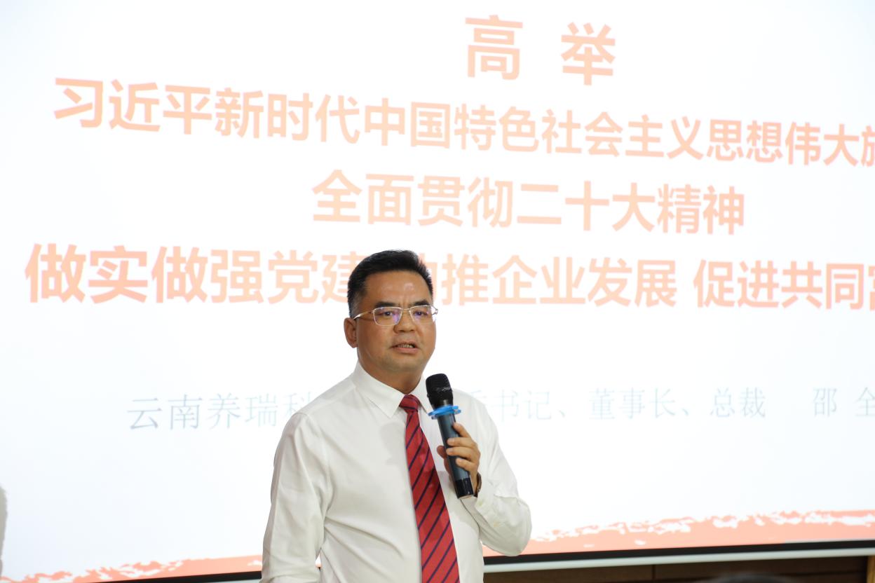 為認真貫徹《中共中央關于認真學習宣傳貫徹黨的二十大精神的決定》,深入學習習近平總書記在二十屆中共中央政治局第一次集體學習時的重要講話精神,把思想統一到黨的二十大精神上來,激勵全體黨員和養瑞人全面學習、全面把握、全面落實黨的二十大精神,指導實踐,推動工作,11月9日,云南養瑞集團組織開展題為“以黨的二十大精神為指引,開創養瑞事業高質量發展新局面”的主題黨日活動。集團黨委書記、董事長、總裁邵全就如何學習好、宣傳好、貫徹好黨的二十大精神進行宣講,給全體養瑞人上了一堂專題黨課輔導。