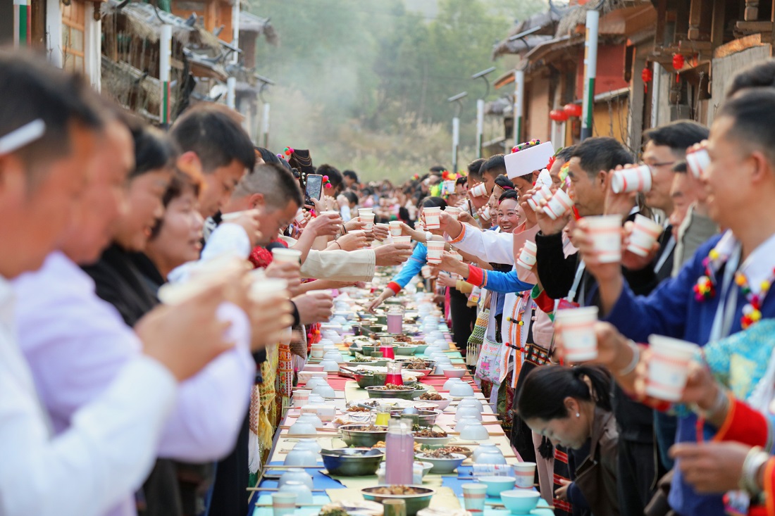 此次長街宴以傈僳族特色菜為主,其中最具代表性的當屬“傈僳漆油雞”、“傈僳粑粑”和“彩色飯”,宴會上,各民族同胞把酒言歡,用各自的祝酒歌向彼此送達了最誠摯的問候和祝福,現場曲調時而激昂悠遠,時而細膩溫婉,席間相互交織,一片歡騰。
