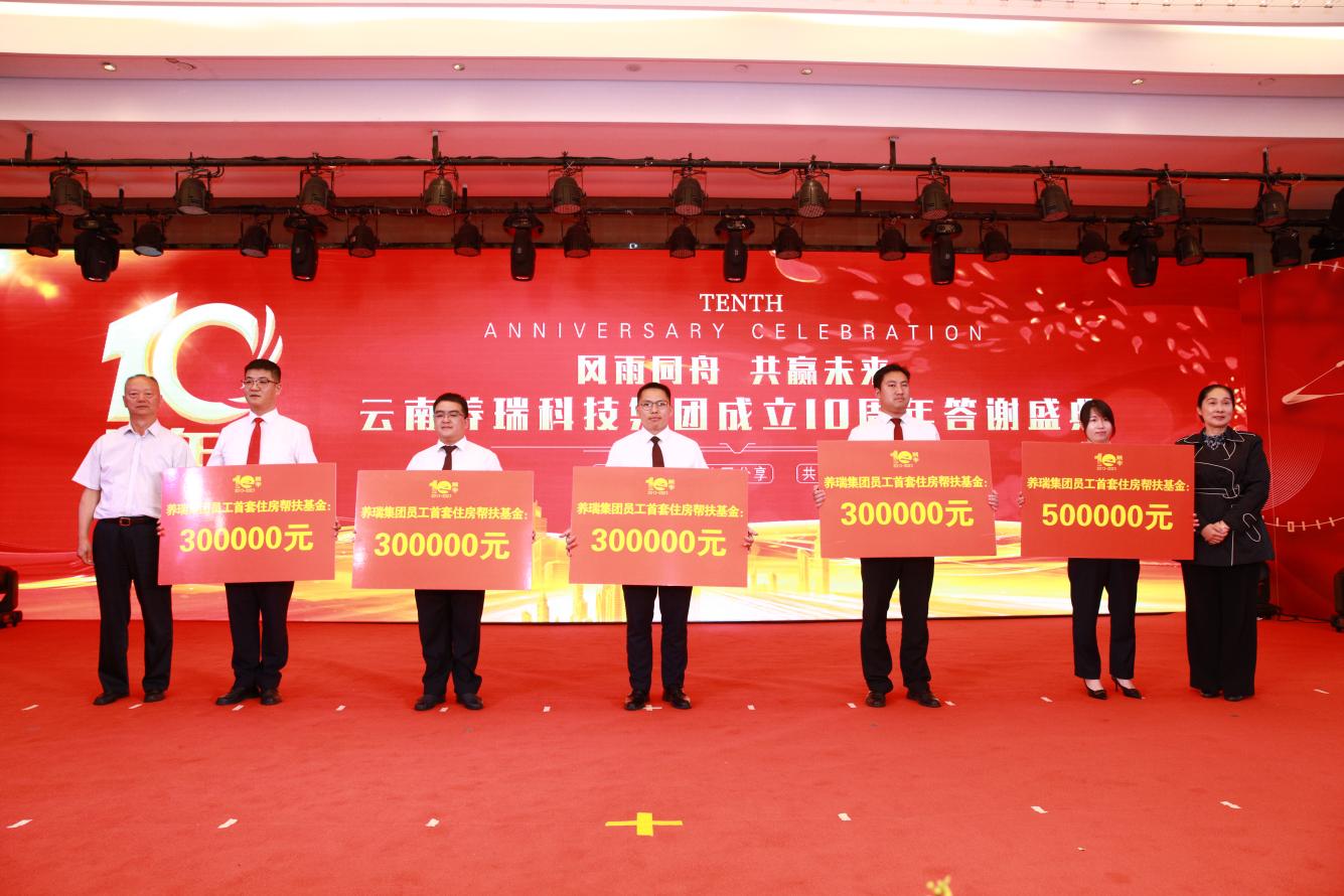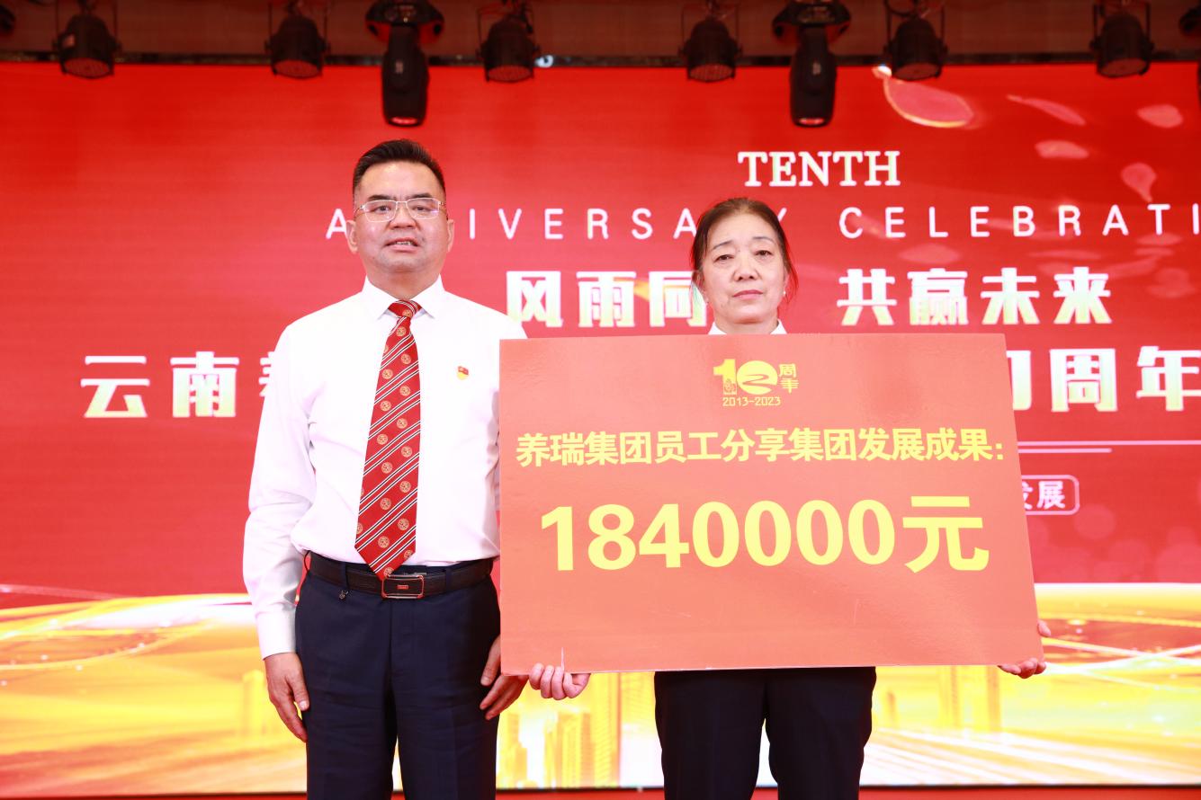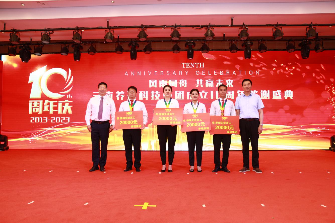 慶典大會上,集團對涌現(xiàn)出來31名先進個人分別授予“養(yǎng)瑞先鋒”“養(yǎng)瑞工匠”“忠誠獎”“優(yōu)秀員工”“先進員工”“最佳新人”等獎杯獎牌并給予表彰獎勵共75萬元,為沒有住房的6名員工共發(fā)放170萬無息幫扶借款,與入職滿5年的40名員工分享企業(yè)發(fā)展成果共184萬。