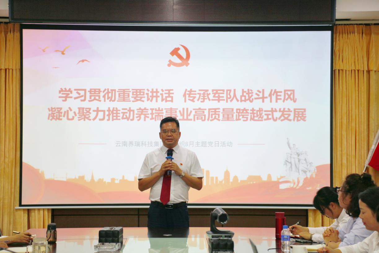 8月19日,為云南養瑞科技集團有限公司黨委組織開展“學習貫徹重要講話、傳承軍隊戰斗作風,凝心聚力推動養瑞事業高質量跨越式發展”主題黨日活動。活動通過深入學習貫徹習近平新時代中國特色社會主義思想,以“老山”精神洗滌思想和靈魂,以黨中央國務院促進民營經濟發展壯大的意見鼓舞信心和斗志,以集團企業文化和為民服務成效推動踐行和落地,激勵和動員全體養瑞人更加緊密地團結在以習近平同志為核心的黨中央周圍,踔厲奮發、篤行不怠,凝心聚力推動養瑞事業高質量跨越式發展。