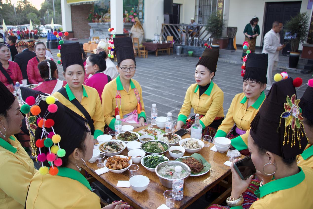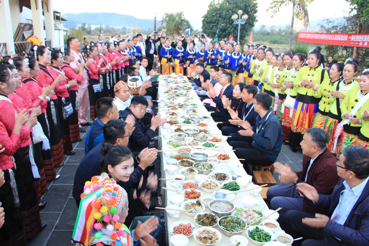 共品民族團(tuán)結(jié)宴,促各民族交往交流交融 喜慶佳節(jié),勝友如云;千里逢迎,高朋滿座。民族團(tuán)結(jié)宴開始后,各民族同胞齊聚一堂,坐在一字排開的長桌旁,一起品嘗芭酥、隔鍋燉魚、酸扒菜等獨具民族特色的菜品,還有只能在重大節(jié)日才能吃到的火燒豬,令人垂涎三尺?;顒又?,各民族以各自的祝酒歌相互問候,為彼此送上美好真摯的祝福。
