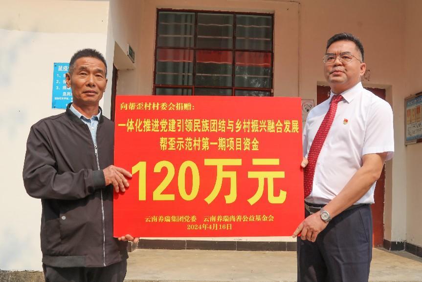 啟動儀式上,邵全代表云南養瑞科技集團向幫歪村捐贈首批項目資金120萬元并致辭。邵全表示,建設幫歪村“黨建引領示范村項目”,是基于養瑞人學習貫徹習近平新時代中國特色社會主義思想和全面落實黨的二十大精神的實踐要求,是基于養瑞人踐行黨的宗旨“全心全意為人民服務”和落實“為善最樂,付出最富”的核心價值理念的必然要求,是基于養瑞人推動帶領全體梁河人民實現共同富裕的價值要求。項目建成后,將推動幫歪村產業升級和發展,促進農民致富增收,為有效解決空殼村莊、留守兒童和鄉村治理等問題貢獻養瑞力量。同時也將為推動民族團結和鄉村振興工作創造新思路、新模式、新賽道,形成新做法、新經驗,為民族團結和鄉村振興工作做出示范和標桿作用。