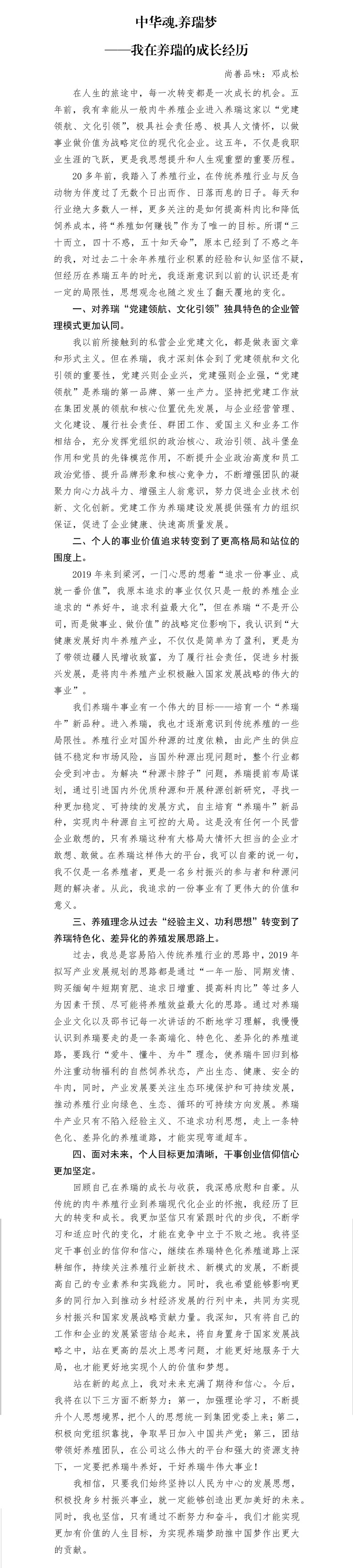 公司內(nèi)部關(guān)系和諧,關(guān)愛員工,吸引了各種人才加入,本科以上學(xué)歷人員達(dá)到50%以上。同時公司還在梁河不斷投入,發(fā)展綠色循環(huán)健康產(chǎn)業(yè),一體化推進(jìn)民族團(tuán)結(jié)與鄉(xiāng)村振興融合發(fā)展,不改邵書記對梁河人民的承諾。公司的核心價值理念就是“為善最樂,付出最富”,通過直接幫扶、產(chǎn)業(yè)幫扶、教育幫扶等多種形式,一直不斷為社會做奉獻(xiàn)。公司未來還將不斷發(fā)展壯大,實(shí)現(xiàn)我們最終目標(biāo)一一實(shí)現(xiàn)養(yǎng)瑞夢、助推中國夢!