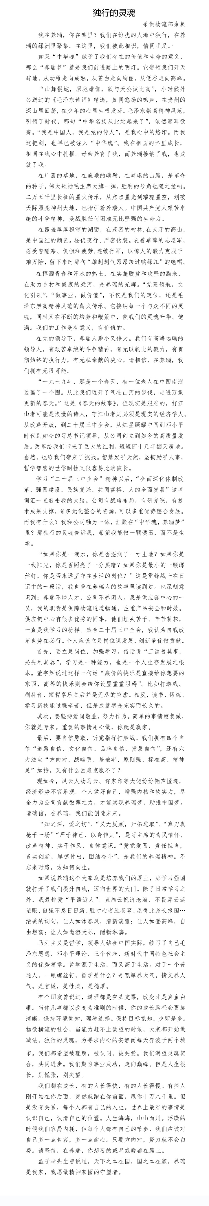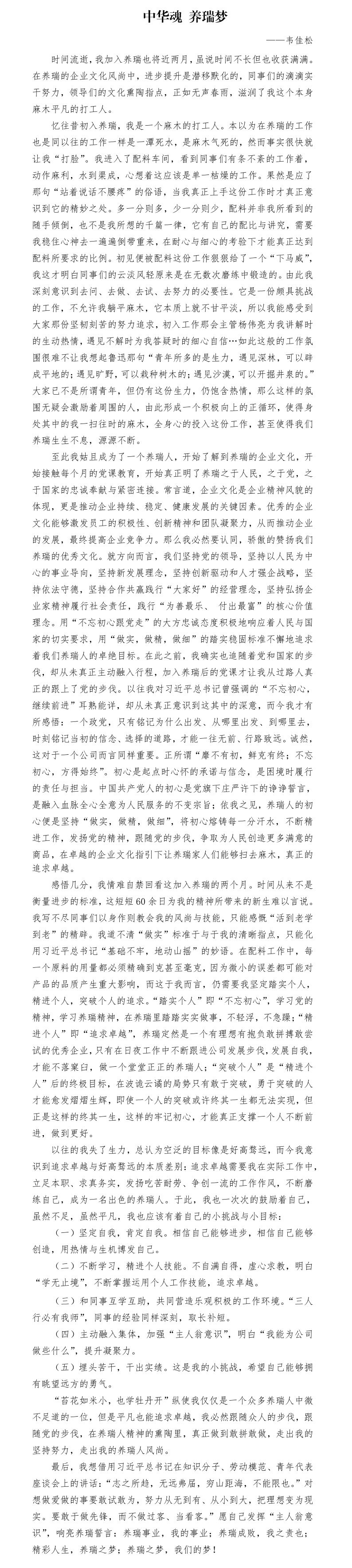 為全面學(xué)習(xí)貫徹習(xí)近平新時代中國特色社會主義思想和黨的二十屆三中全會精神,2024年8月至9月,云南養(yǎng)瑞集團(tuán)舉辦了主題為“中華魂·養(yǎng)瑞夢”的征文比賽和書香家庭學(xué)習(xí)成果展覽活動,號召全體員工及家屬共同學(xué)習(xí)中華優(yōu)秀傳統(tǒng)文化、毛澤東崇高精神風(fēng)范和企業(yè)黨建文化。截止2024年9月30日,共在全體員工中征集到詩歌作品49首、理論文章48篇;在員工子女中征集到詩朗誦作品2個、書法作品2幅、繪畫作品9幅。現(xiàn)將部分優(yōu)秀作品進(jìn)行展示,以此展現(xiàn)養(yǎng)瑞人的智慧與才華、風(fēng)采與夢想。