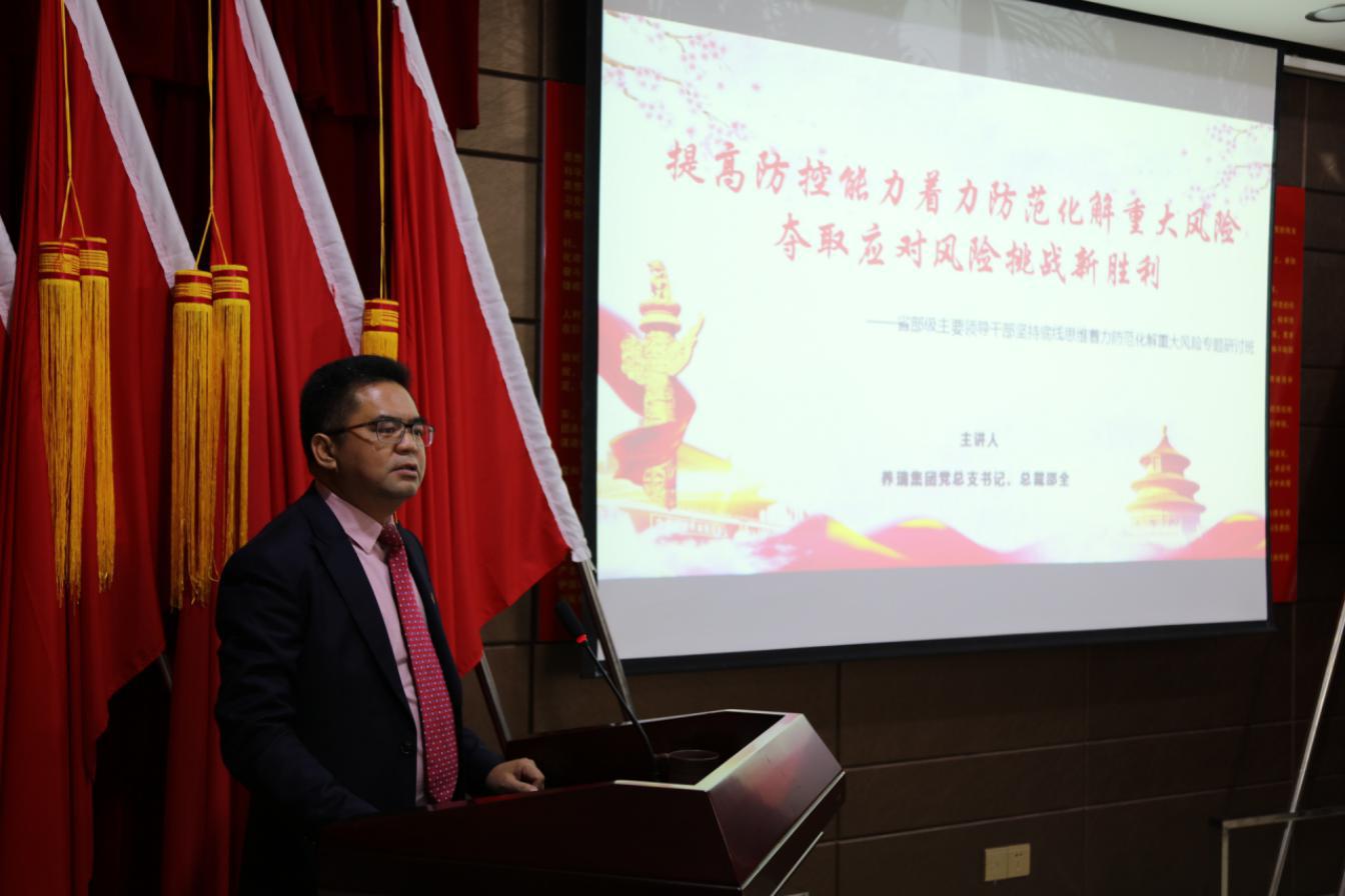 “事者,生于慮,成于務,失于傲”黨日活動中,集團黨總支書記、總裁邵全從學懂當前我國形勢、重大風險、應對辦法、防范措施,弄通習總書記對各領域防范化解重大風險作出具體指導,做實養瑞事業健康持續高質量發展等3個方面對《習近平:在省部級主要領導干部堅持底線思維著力防范化解重大風險專題研討班開班式上的重要講話》的內容進行了全面深入系統的領學,會議指出,習近平總書記的重要講話高瞻遠矚、思想深邃、居安思危、語重心長,對保持政治社會大局穩定和經濟持續健康發展、實現“兩個一百年”奮斗目標具有重大現實意義和長遠指導意義。要深刻認識新形勢下防范化解重大風險的重大意義,始終把防范化解重大風險擺在突出位置,切實肩負起政治責任,堅決打贏防范化解重大風險攻堅戰。邵書記著重強調,深刻領會習近平總書記重要講話的精神實質、豐富內涵及工作要求,務必把集團黨建工作和企業經營管理工作從思想上、行動統一到習近平總書記重要講話精神上來,統一到集團的戰略布局和發展規劃上來,增強“四個意識”、堅定“四個自信”、做到“兩個維護”,堅持“123456 25510”工程的黨建思想,敢于擔當、主動付出,以“踏平坎坷成大道,斗罷艱險又出發”的頑強意志,應對好每一場重大風險挑戰。